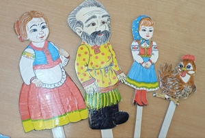 Фигурки для театра. Плоскостные фигурки на палочках, сделаны из картона, дети руководят ими стоя за ширмой и держат фигурки за палочку. Цель: развитие выразительной речи, крупной моторики рук. |